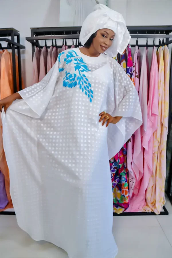 Ce magnifique boubou en tissu brodé blanc séduit par sa texture à pois raffinée et son motif floral bleu turquoise qui apporte une touche de fraîcheur et de modernité.