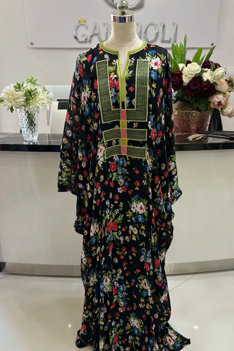 Les manches larges ou droites, selon la version, ajoutent du volume avec subtilité, tandis que l’encolure reste sobre pour laisser place à l’imprimé fleuri.