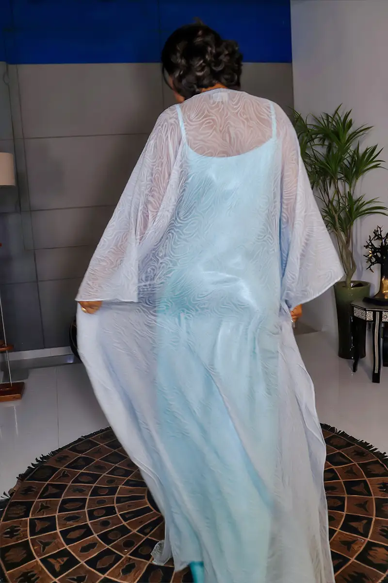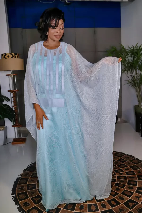 Cette robe longue bleu clair présente une superposition de tissus. La sous-robe est d’un bleu uni, tandis que la couche supérieure est un voile léger avec un motif texturé abstrait en blanc. La coupe est ample et fluide, avec des manches larges, et le devant est orné de bandes verticales et horizontales de tissu uni, créant un effet géométrique subtil.