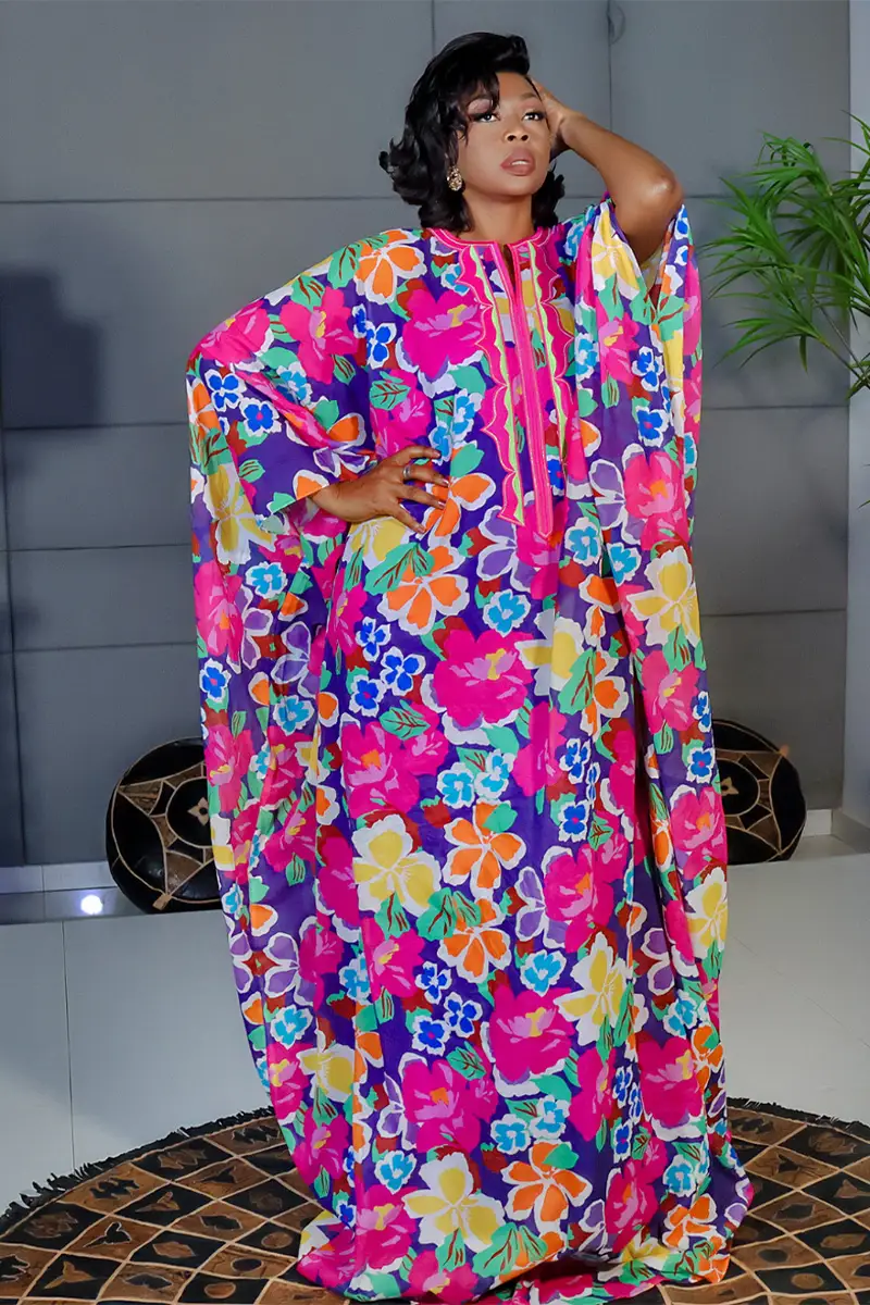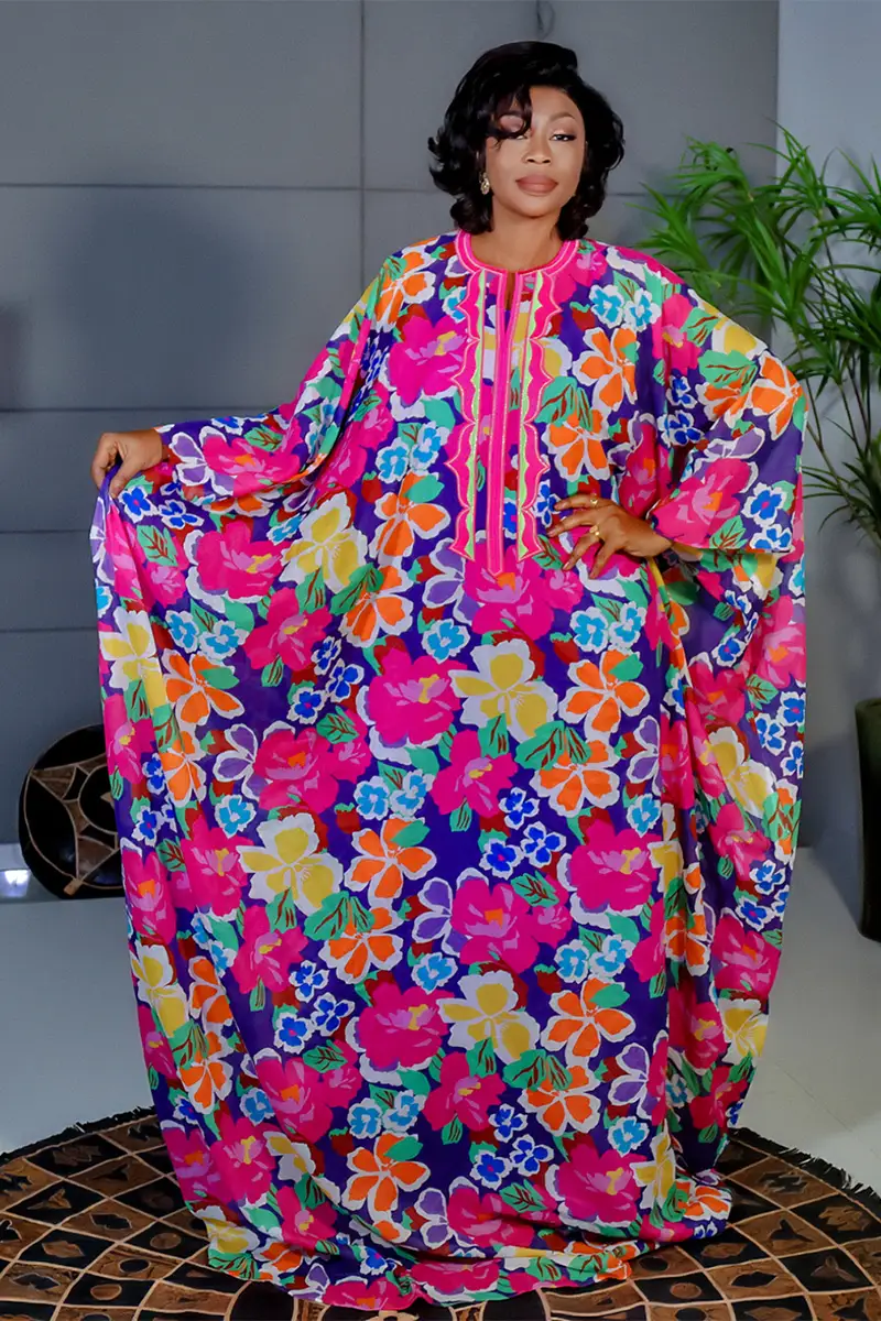 Cette robe longue arbore un imprimé floral éclatant et audacieux avec des fleurs de différentes tailles dans des tons de rose vif, orange, jaune, bleu et vert, sur un fond violet. La coupe est ample et fluide, avec des manches larges, et le col est orné d’une broderie rose.