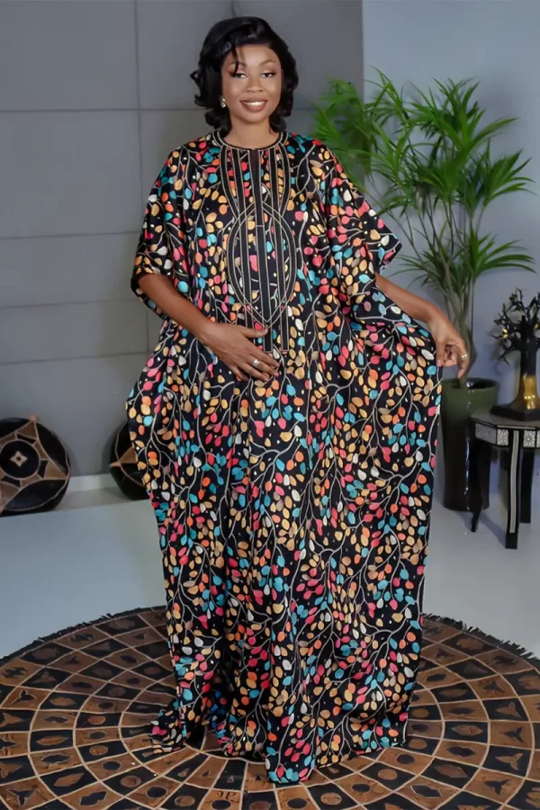Cette élégante robe kaftan présente une silhouette ample et fluide avec des manches larges, ornée d’un motif de feuilles multicolores éclatantes sur un fond sombre. Le design inclut une broderie dorée complexe autour de l’encolure, ajoutant une touche de sophistication. Parfaite pour un look confortable et stylé.