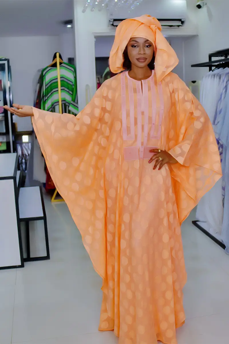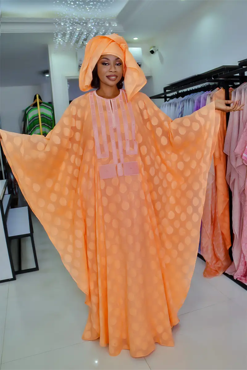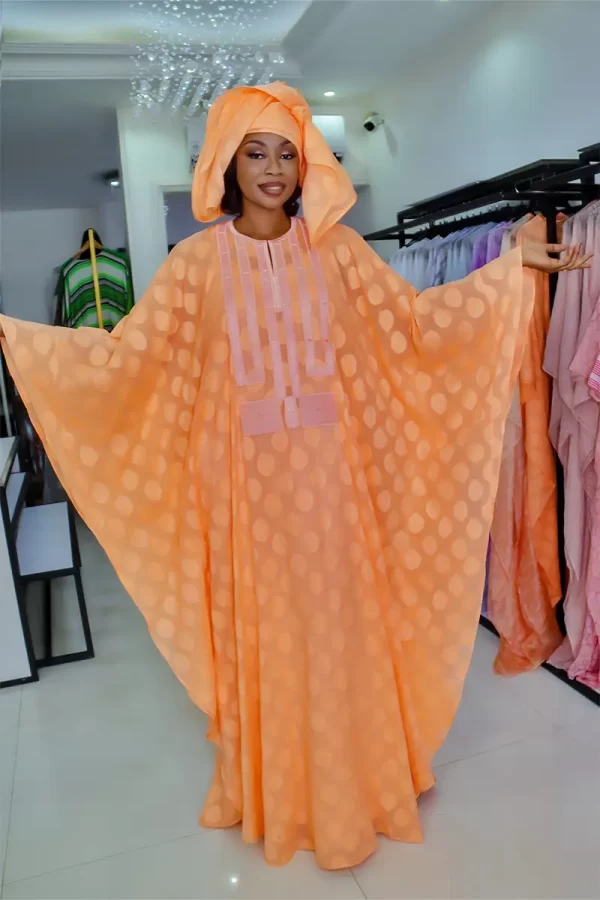 Cette robe longue de couleur orange vif présente un motif de pois ton sur ton. La coupe est ample et fluide, avec des manches larges, et le col est orné d’une broderie géométrique en bandes de tissu. La tenue est complétée par un foulard assorti, drapé élégamment sur la tête.