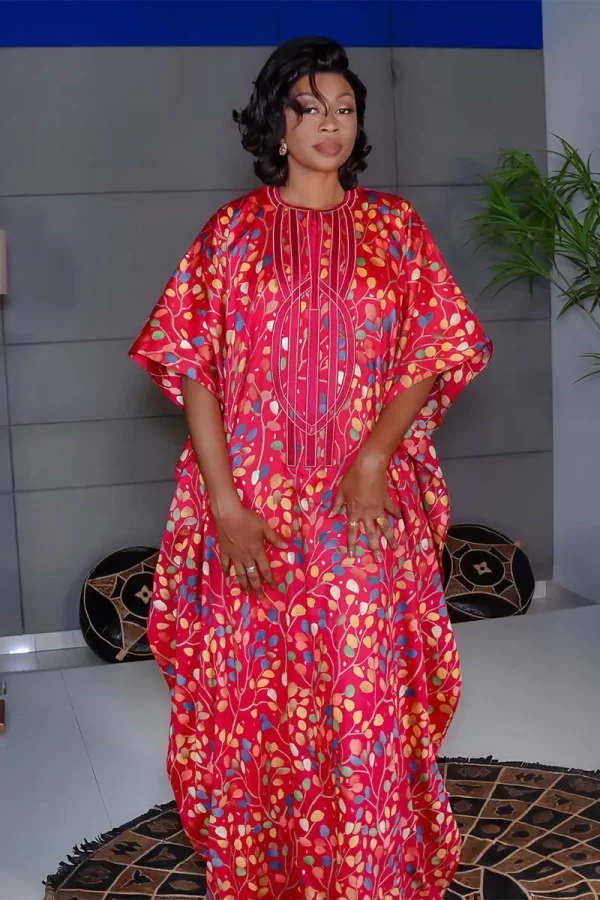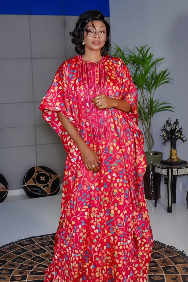 Cette robe longue rouge vif présente une coupe ample et fluide avec des manches larges. Elle est ornée d’un motif délicat de feuilles multicolores et d’une broderie complexe au niveau du col, ajoutant une touche d’élégance. Idéale pour un style confortable et chic.